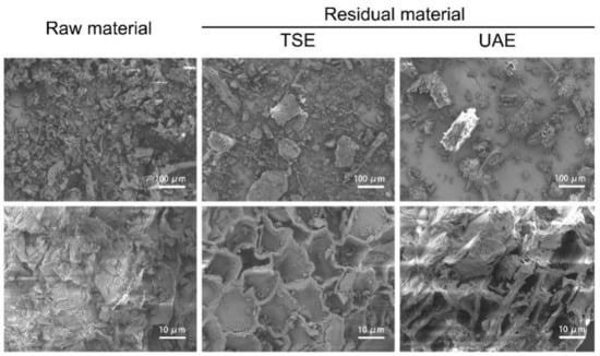 Scanning electron microscopy images of J. mandshurica samples and residues treated by different extraction techniques with different magnifications are shown in Figure 6. The surface of the untreated powder was intact, which was obviously different to the surface morphology of the powders treated by the two methods described above. Many holes appeared in the samples treated by UAE or TSE, and the holes were deeper in the powders treated by UAE. It was speculated that this might be due to the characteristics of ultrasound, such as the cavitation phenomena, sponge effect, and mechanical mixing effect. Indeed, ultrasound treatment can generate a certain number of pores and greatly change the structure of plant materials, which is more conducive to the diffusion of extraction solvent into cells and the leakage of intracellular solutes, so as to facilitate the extraction of the effective components [26,27].