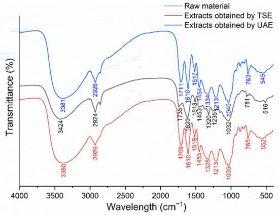 FTIR spectrum analysis of the raw materials and extracts obtained by UAE and TSE.