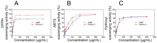 The antioxidant potential of JMBF extracted by UAE was evaluated via multiple in vitro tests as described previously, including the scavenging assays of DPPH, ABTS, and hydroxyl radical [44,45,46]. Vc was introduced as a positive control substance.