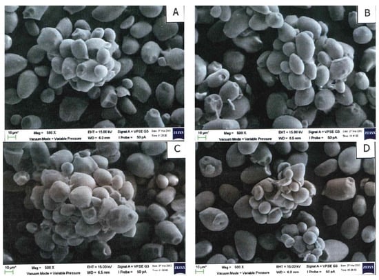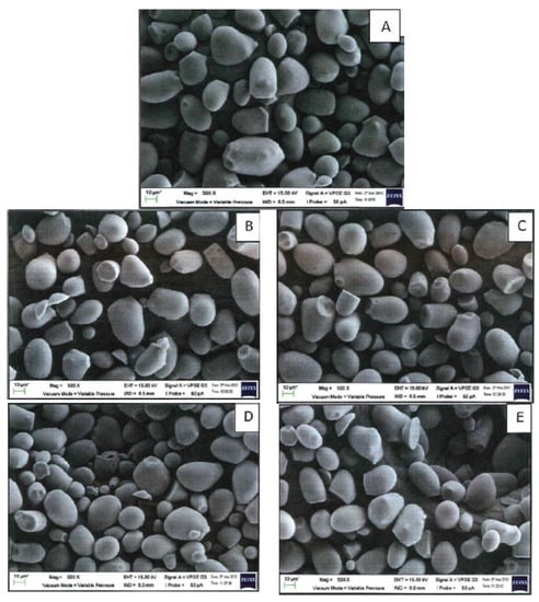 The granules were observed by Scanning Electron Microscopy (EVO MA10, Carl Zeiss Microscopy, Jena, Germany) with 500× and 2000× magnification. Starch sample was suspended in a carbon tape and coated with a fin layer of gold–palladium using a sputter coater (Polaron SC500, Quorum Technologies, Lewes, UK).