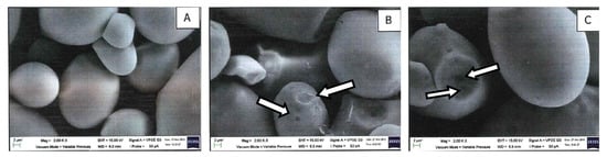 Dent surfaces and the development of pores on the starch granules (indicated by the arrows) are found on the ANN(To-5) and the ANN(To-10), as depicted in Figure 2. Xu et al. [47] reported most of the potato starch granules retained their original appearance, whereby only a small number of starch granules appeared with grooves and dents on their granule surfaces after annealing. Rocha et al. [48] found an increase of the pores on the surface of the granules for both the normal and waxy con starches and attributed this to the hydrolysis activity of the endogenous amylase under the annealing condition. No pronounced change occurred in the granule morphology when ANN was applied to green banana flour [49]. Waduge et al. [50] found that annealed starch exhibited increased granular size due to the ingress of moisture through the amorphous regions of the starch during annealing, which was not seen in this study.