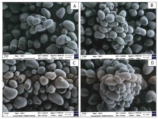 Partial gelatinization had taken place in the annealed and dual-modified starches, as shown by the agglomeration of the starch granules (Figure 3 and Figure 4). No morphological differentiation can be found in these single-modified and dual-modified samples. Since the ANN temperature for the samples in Figure 3 (To-5) is closer to the onset gelatinization temperature of the sago starch, more extensive agglomerations are observed compared to those annealed at (To-10) (Figure 4). Differing from this study, even though Rocha et al. [48] used an ANN temperature much closer to the melting of corn starches (3 °C below To), no agglomeration of the starch granules was observed by the researchers.