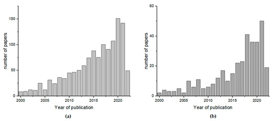 The number of papers published between 2000 and 2022 with the key words (a) “honey classification” and (b) “honey authentication” according to Scopus (www.scopus.com, accessed on 13 June 2022).