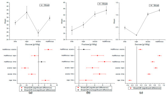 The comparison of the average means of sugars content obtained by ANOVA: (a) for glucose, (b) for fructose, and (c) for sucrose (Tukey test, p < 0.05).