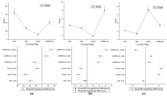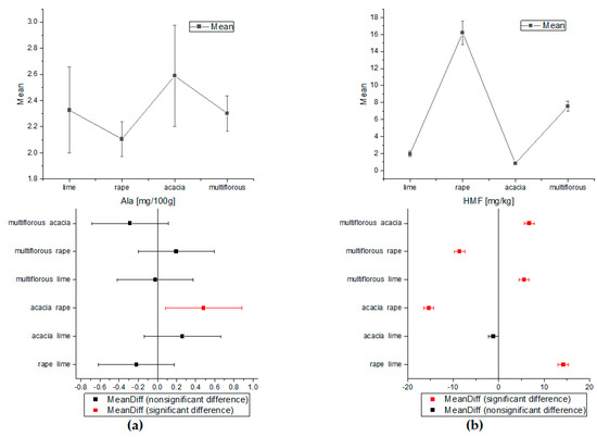 The one-way ANOVA test of Tukey’s comparison was also performed for amino acids and HMF concentrations (Figure 3 and Figure 4). On the basis of the proline and tyrosine average contents, the differentiation between all types of honey proved possible. Apart from the rape and lime honeys, the concentrations of Phe were statistically significant for all analyzed nectars. Alanine showed a statistically significant difference only in acacia and rape honey. Additionally, analysis of variance for HMF indicated statistically different concentrations for all types of honey except acacia and lime samples.