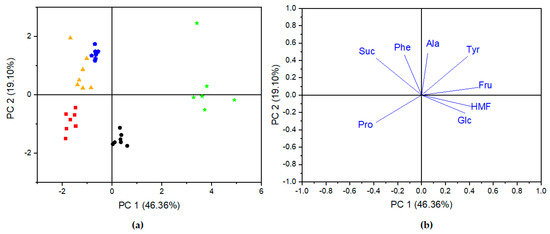 PC1 = 0.3817 × Glc + 0.4899 × Fru − 0.3999 × Suc − 0.3958 × Pro − 0.1571 × Phe + 0.4268 × HMF + 0.3931 × Tyr + 0.0555 × Ala