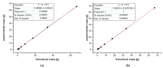 Quantitative accuracy requires the correct repetition time (Tr), which is defined as the time from the application of an excitation pulse to the next pulse, and it includes the relaxation delay and the acquisition time [49]. To ensure complete magnetization recovery, the TR value should be calculated as a multiple (five to seven times) of the longest T1 in the sample. The quality of an analytical method is dependent on the linearity of the calibration curve. To check the linearity of the proposed method, 1H NMR spectra for 8 series of glucose solutions (0.48, 0.96, 1.92, 4.21, 8.43, 17.50, 33.71, and 66.82 g/100 g) were recorded with two different repetition times: Tr = 6 s and 8.5 s. Each sample was analyzed in triplicate in random order. Linear relationships with very good correlation coefficients (R = 0.9999 and R = 0.99999) were observed when the absolute concentration of glucose was plotted against that calculated from integrals. The results are shown in Figure 6 and in Supplementary Materials. Satisfactory results were obtained for both calibration curves; thus, for further measurements, the repetition time of 6 s was selected to minimize the time of experiments. Moreover, as a criterion of acceptance for the analytical method, we assumed a recovery between 98 and 102%; therefore, we rejected the repetition time of 8.5 s, where a recovery above 102% was observed (see Tables S2 and S3 in Supplementary Materials).
