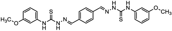 A solution of terephthaldehyde (0.1 mmol) in 100 mL ethyl alcohol was refluxed with 4-(meta-methoxyphenyl)-3-thiosemicarbazide (0.2 mmol) for 5 h with a few drops of glacial acetic acid. After cooling to room temperature, a solid mass was separated and recrystallized from ethyl alcohol with an 83% yield. The yellow product (221–223 °C) was characterized by various spectroscopic techniques. IR: 3289.5 and 3139.6 cm−1 (N–H, amines), 3079.3 cm−1 (C–H, aromatic), 2945.3 cm−1 (C–H, aliphatic), 1548.6 cm−1 (C=N, imine), 1463.8 cm−1 (C=C, aromatic); 1168.7 and 1051.5 cm−1 (C-O, sy and asy). 1H-NMR (DMSO-d6): δ 3.73 (6H, s, -OCH3), 6.65 (2H, dd), 7.17–7.46 (6H, d, aromatic ring), 7.57 (4H, dd, aromatic ring), 7.94 (2H, s, -CH=N-), 9.93 (2H, s, NH), and 11.47 (2H, s, NH). 13C NMR (DMSO-d6): δ 57.2, 107.1, 114.9, 121.3, 129.6, 131.2, 133.7, 134.1, 139.1, 139.9, 159.4, 178.3.
