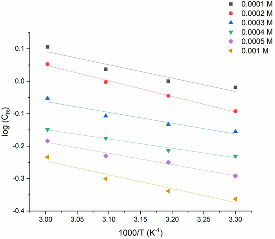 Arrhenius Equation (1) was used to calculate the activation parameters of the corrosion process (Figure 4):