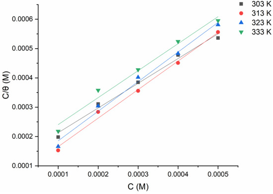 The adsorption process is linked to the barrier-shielding layer covering the electrode surface . Temkin, Frumkin, Flory–Huggins, and Langmuir adsorption isotherm models are used to fit the gravimetric measurements using the relationship (Equation (4)) between the inhibitor concentration and the surface coverage . The more suited adsorption model was developed (the Langmuir adsorption isotherm (as seen in Figure 6)) considering the high correlation coefficient , which depicts the inhibitor-adsorption mechanism excellently, as per [32,33]: