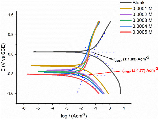 Figure 7 displays the polarization curves for the tested coupon in 1.0 M corrosive media with different PMBMH concentrations at 303 K. Table 3 lists the data for the inhibitory performances, corrosion potential (), and corrosion current density (), in addition to the anodic () and cathodic () Tafel slopes. These numbers were generated using the Tafel fit technique offered by the Gamry Echem analyzer program, which uses a nonlinear chi-squared minimization to fit the data to the Stern–Geary equation. Equation (6) represents how the inhibition efficiency was estimated: