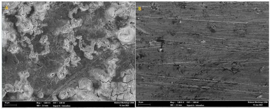 SEM micrographs showing the surface morphology of mild-steel-coupon surface in absence (A) and presence (B) of 0.0005 M PMBMH in 1 M HCl environment for 5 h at 303 K.
