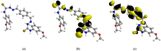 The optimized chemical structure (a), highest occupied molecular orbital (b), and lowest unoccupied molecular orbital (c) of the tested inhibitor.