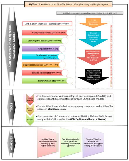Biofilms are the most robust colonization form of microbes and showed up to 1000-fold resistance to antibiotics [38]. It encompasses a highly specialized form of approaches to fight against environmental cues, including antibiotics, such as an expression of efflux pumps, polysaccharide enriched matrix, oxygen gradients, and many more [39,40,41]. Hence, it is important to target biofilms to overcome the menace of antibiotic resistance globally [42]. Therefore, we developed a web-based platform named “Biofilm-i” for predicting the potential of (un)known chemicals to degrade biofilms. It also encompasses various analysis tools for exploring the query compounds.