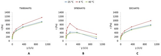 Shear stress [τ] (Pa) versus shear rate [] (s−1) profile of (A) TW80AATG, (B) SP80AATG and (C) SCDAATG.