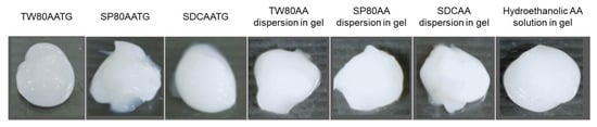 The appearance of the AATGs was evaluated by visual observation and taking a photo of a gel sample (1–2 g) on a watch glass after storage at 25 ± 2 °C, 4 ± 2 °C and 40 ± 2 °C for 1 day and 1, 2 and 3 months.
