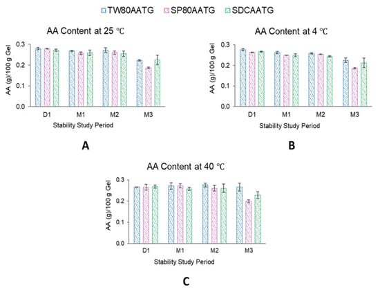 At 4 °C, the AA content of SP80AATG, SDCAATG and TW80AATG significantly decreased at the end of 1, 2 and 3 months, respectively. At 25 °C, a significant decrease in the AA content was observed with both SP80AATG and TW80AATG at the end of 1 and 3 months, respectively. At 40 °C, only the AA content of SP80AATG significantly decreased after 3 months (p < 0.05) (Figure 5).