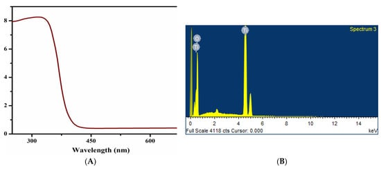 The biofabricated TiO2 NPs were exposed to numerous characterization techniques, such as UV, SEM, EDX and FTIR. Systronics Halo DB-20, Dynamica Scientific Ltd., was used to confirm the synthesis of TiO2 nanoparticles through UV-visible spectroscopy by using a spectrum between 200 and 650 nm of light wavelength for the reaction sample. An FTIR spectrophotometer was used to perform an FTIR analysis between 400–4500 cm−1 to illustrate the potential biomolecules responsible for the reduction, capping and stabilization of TiO2 nanoparticles. Scanning electron microscopy (SIGMA model, Zeiss, Germany) at 15.5 kV was used to study the size, morphology and image of TiO2 nanoparticles. EDX XL-30 was utilized at 15.5–25.5 keV to study other elements that accompany TiO2 nanoparticles. The values of EDX showed the atomic structure and atomic contents of the biofabricated nanoparticles.