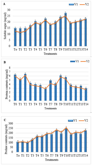 The method of ref. [43] was used to analyze the soluble sugar content using the phenol sulphuric acid method. A total of 0.5 g of fresh leaves was collected and placed in test tubes containing 80% ethyl alcohol, followed by boiling in a water bath at 80 °C for 1 h. A total of 0.5 mL of sample extract was taken in separate test tubes, followed by the addition of 1 mL of 18% phenol and the mixture was allowed to incubate at room temperature. A total of 2.5 mL of sulfuric acid was added to the mixture and properly shaken, and then the absorbance was recorded at a wavelength of 490 nm using a spectrophotometer. The following formula was used to calculate the soluble sugar content: