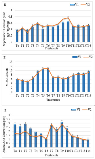 Under salinity stress, malondialdhehyde content increases in the tissues of plants as a lipid peroxidation product that represents the oxidative damage caused by salinity, leading to injury to the membranes. An increase in the MDA content production leads to membrane injury and then leakage of membrane electrolytes [33,34]. Plants also retain a well-defined detoxification system to regulate ROS levels, which is often by different enzymatic and non-enzymatic antioxidants. These antioxidants are SOD, catalase (CAT), peroxidase (POD) and ascorbate peroxidase (APX). SOD works as the first line of defense in the case of oxidative damage. It converts SO radicals to H2O2 according to ref. [1]. Although all antioxidant enzymes remarkably increased under salinity conditions, in the present study, salinity stress caused an increase in the contents of MDA and SOD in both wheat varieties, while TiO2 nanoparticles reduce the production of MDA and SOD contents under salinity stress according to ref. [19].