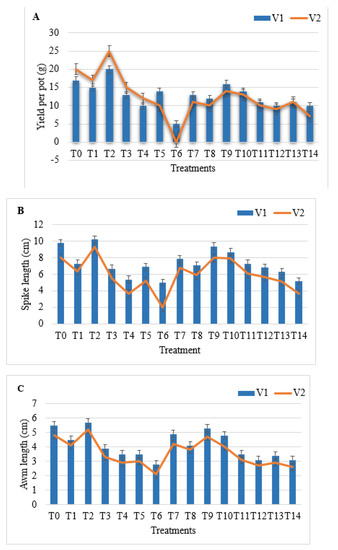 The yield parameters, such as, yield per pot, spike length, awn length, grain numbers on each spike and hundred-grains weight of seeds, were observed ref. [48].