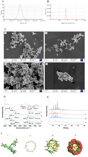 Characterization of EGCG@β-CD NPs. (A) Size distribution of EGCG@β-CD NPs. (B) zeta potential distribution of EGCG@β-CD NPs. (C) SEM images of the EGCG@β-CD NPs and β-CD. (i) and (ii) represent the SEM images (magnification ×10,000) of the EGCG@β-CD NPs and β-CD, respectively. (iii) and (iv) represent the SEM images (magnification ×50,000) of the EGCG@β-CD NPs and β-CD, respectively. (D) FT-IR spectra. (i) EGCG, (ii) β-CD, (iii) physical mixture of EGCG and β-CD, and (iv) EGCG@β-CD NPs. (E) XRD. (i) EGCG, (ii) β-CD, (iii) physical mixture of EGCG and β-CD, and (iv) EGCG@β-CD NPs. (F) Molecular docking. (i) 3D structure of EGCG, (ii) 3D structure of β-CD, (iii) molecular force of EGCG and β-CD, and (iv) 3D structure of EGCG@β-CD NPs.