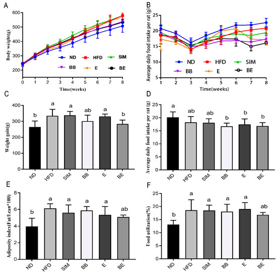 Effects of EGCG@β-CD NPs and EGCG on body weight, food intake, weight gain, adiposity index, and food utilization. (A) Body weight. (B) Average daily food intake per rat. (C) Weight gain. (D) Average daily food intake per rat. (E) Adiposity index. (F) food utilization. All results are expressed as mean ± SE (n = 8 rats/group), Superscript characters indicate significant differences between treatments. ND: normal diet + purified water; HFD: high-fat diet + purified water; SIM: high-fat diet + 5 mg/kg·bw simvastatin; E: high-fat diet + 100 mg/kg·bw EGCG; BB: high-fat diet + 100 mg/kg·bw β-CD; BE: high-fat diet + 200 mg/kg·bw EGCG@β-CD NPs (100 mg/kg·bw EGCG).