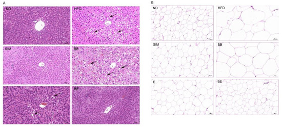 Effects of EGCG@β-CD NPs and EGCG on alleviation of hepatic lipid accumulation in high-fat diet-induced hyperlipidemic rats. (A) Liver steatosis ratio stained with hematoxylin and eosin (H&E). (B) White adipose stained with H&E. Scale bar = 50 µm. All results are expressed as mean ± SE (n = 8 rats/group). ND: normal diet + purified water; HFD: high-fat diet + purified water; SIM: high-fat diet + 5 mg/kg·bw simvastatin; E: high-fat diet +100 mg/kg·bw EGCG; BB: high-fat diet + 100 mg/kg·bw β-CD; BE: high-fat diet + 200 mg/kg·bw EGCG@β-CD NPs (100 mg/kg·bw EGCG).