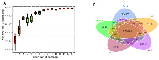 The open reading frame (ORF) predicted the Scaftigs (≥500 bp) assembled from both single and mixed by MetaGeneMark (V2.10, http://topaz.gatech.edu/GeneMark/, accessed on 23 December 2020) software, and filtered the length information shorter than 100 nt [27,28] from the predicted result with default parameters. For predicted ORF, CD-HIT [29] software (V4.5.8, http://www.bioinformatics.org/cd-hit, accessed on 24 December 2020) was adopted to redundancy and obtained the unique initial gene catalogue [30]. The clean data of each sample were mapped to initial gene catalogue using Bowtie2.2.4, which obtained the number of reads to which genes were mapped in each sample [28,31]. We then filtered the genes when the number of reads ≤ 2 [32] in each sample and obtained the gene catalogue (genes) eventually used for subsequent core-pan gene analysis, correlation analysis of samples and Venn figure analysis.