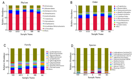 (A–D) Relative abundance analysis at the phylum, order, family and species level in all groups, with different colored bars standing for different gut microbiota compositions. ND: normal diet + purified water; HFD: high-fat diet + purified water; E: high-fat diet + 100 mg/kg·bw EGCG; BB: high-fat diet + 100 mg/kg·bw β-CD; BE: high-fat diet + 200 mg/kg·bw EGCG@β-CD NPs (100 mg/kg·bw EGCG).