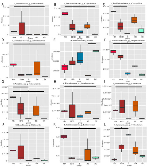 Significantly different taxa displayed in box diagram at genus level. Significantly varying taxa have been identified by t-test/ANOVA (adjusted p-value (q) < 0.05). At genus level, the Gracilimonas (A), Coprobacter (B), Carnobacterium (D), Butyricimonas (F), Alloprevotella (G), Agrobacterium (H), as well as Rhodobacter (I), Millionella (J), and Ruminococcus (K) were highly represented in the ND group than those in the BE group. On the other side, Cupriavidus (C) and Alloprevotella (G) were more abundant in the ND than in the E group, while Fretibacterium (L) was the opposite. Furthermore, the relative abundance of Enorma (E) was significantly higher in the BE group compared to the BB group. “*” indicated significant difference between the two groups (q value < 0.05), “**” indicated significant difference between the two groups (q value < 0.01). ND: normal diet + purified water; HFD: high-fat diet + purified water; E: high-fat diet +100 mg/kg·bw EGCG; BB: high-fat diet + 100 mg/kg·bw β-CD; BE: high-fat diet + 200 mg/kg·bw EGCG@β-CD NPs (100 mg/kg·bw EGCG).
