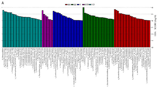 To recognize the specific bacterial taxa related to the intervention of EGCG@β-CD NPs, the gut microbiota in the high-fat diet-induced hyperlipidemia rat model were exhibited by LEfSe. Taxa with an LDA score threshold > 4 were contained in the LEfSe and counts of very-low-abundance bacteria were ignored (Figure 7A). Studies found that the ND group was dominated by the order Bacteroidales. Different treatments of high-fat diets had distinct marker bacteria. The HFD group was largely characterized by the species Blautia_sp_CAG_257, Bacteroides_caecimuris, Anaerotruncus_colihominis, Bacteroides_congonensis and Bacteroides_fragilis. The E group was characterized by the species Clostridium_sp_CAG_169, Lachnoclostridium_Clostridium_bolteae, Adlercreutzia_equolifaciens, Flavonifractor_sp_An306, Firmicutes_bacterium_CAG_555, Oscillibacter_sp_PC13, Clostridiales_bacterium_1_7_47FAA, Oscillibacter_sp_CAG_155, Firmicutes_bacterium_CAG_103 and Clostridiales_bacterium_VE202_28, whereas the species Gemmiger_sp_An120, Streptococcus_gallolyticus, Fournierella_massiliensis, Lachnoclostridium_sp_An196, Phascolarctobacterium_sp_CAG_207, Firmicutes_bacterium_CAG_145, Gemmiger_sp_An194, An87, An50, Anaerofilum_sp_An201, Erysipelatoclostridium_Clostridium_saccharogumia, Subdoligranulum_variabile, Collinsella_stercoris and intestinalis were the highest proportion bacteria in the BE group. This indicated that the microbial species differed greatly between the different treatments at the species level.