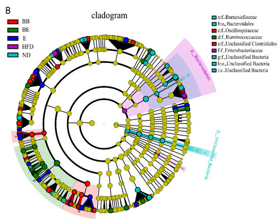 LEfSe analysis of gut microbiota among the samples. (A) The LDA value distribution histogram represented species with significant differences between groups, and the length of the histogram showed the size of the influence of the different species (the default setting is 4). (B) LEfSe analyzed the most significant abundant taxa in gut microbiota of the high-fat-diet-induced hyperlipidemia rat model. BB-enriched taxa (Red); BE-enriched taxa (Green); E-enriched taxa (Blue); HFD-enriched taxa (Purple); ND-enriched taxa (Palegreen). The diameter of the small circle was directly proportional to the relative abundance. ND: normal diet + purified water; HFD: high-fat diet + purified water; SIM: high-fat diet + 5 mg/kg·bw simvastatin; E: high-fat diet + 100 mg/kg·bw EGCG; BB: high-fat diet + 100 mg/kg·bw β-CD; BE: high-fat diet + 200 mg/kg·bw EGCG@β-CD NPs (100 mg/kg·bw EGCG).