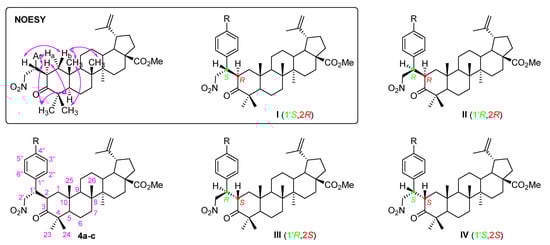 Secondly, a Michael addition of nitromethane to α,β-unsaturated carbonyl compounds 3a-c was accomplished in the presence of 1,8-diazabicyclo[5.4.0]undec-7-ene (DBU) as a base, under neat conditions (i.e., nitromethane was used as reagent as well as solvent), affording Michael adducts 4a-c in good yields (69–79%). This reaction led to the creation of two new stereocenters and, consequently, it would be expected that a mixture of diastereomers I to IV would be obtained (Figure 3). However, a single diastereomer was formed. Usually, the asymmetric Michael addition of nitromethane involves the use of complex organocatalysts [23,24,25], however, in our particular case, their use was not required, since the observed diastereoselectivity was inducted by the defined stereochemistry of the triterpene scaffold.