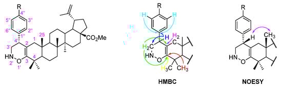 The formation of 1,2-oxazine-fused BoOMe compounds 5a-c was confirmed by 1D and 2D NMR techniques. Thus, in their 13C NMR spectra, the appearance of two non-protonated carbons at δC 92.6–98.9 and 180.8–182.1 ppm, which were unequivocally assigned as C-2 and C-3, respectively, by their HMBC connectivities with H-1 and H-3′, and H-3′ and 4-(CH3)2 (Figure 4), proves the fusion of a 1,2-oxazine-type ring to the A-ring of BoOMe. In addition, the band at 3300–3350 cm−1 observed in the ATR-FTIR spectrum of compound 5b confirms the presence of a secondary amino group in the structure of this compound (Figure S14). Furthermore, the relative configuration of the C-4′ stereocenter was unveiled through NOESY spectroscopy (Figure 4). Close proximity was observed between H-4′ and H-25 in the NOESY spectra of compounds 5a-c (Figure S17 illustrates the main NOE effects for derivative 5c).