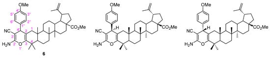 Among the plethora of O-heterocycles, the 4H-pyran scaffold (Figure 2) stands out as it can be found in coumarins, benzopyrans, sugars, flavonoids and xanthones, among others [16]. It also can be regarded as a key pharmacophore playing a pivotal role in several biological activities, especially as anticancer agents [16]. Within the family of 4H-pyrans, special attention should be given to the 2-amino-3-cyano-4H-pyran derivatives, as part of 2-amino-3-cyano-4H-chromenes, which is a key scaffold in the anticancer agent crolibulin (EPC2407) currently in phase I/II clinical trials [17]. Once again, to the best of our knowledge, it is the first time that this specific type of 4H-pyran was fused to a lupane-type pentacyclic triterpenoid.