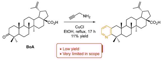 Concerning pyridines (Figure 2), they are one of the most prevalent examples of biologically active heterocycles, being the second most common ring in small molecule drugs. This is quite understandable since the pyridine ring is often used as an isosteric and/or bioisosteric replacer of phenyl rings [18,19]. There is only one example of a pyridine-fused BA compound [20]. It was prepared by treatment of betulonic acid (BoA) with propargyl amine via an intermediate enamine, which in the presence of CuCl catalyst performs a ring closure to form pyridine (Scheme 1). However, this method is quite limited both in reaction yield and the ability to install different substitution patterns. Nevertheless, this pyridine-fused BA compound was further tested against the axenic amastigotes of Leishmania donovani and inhibited 88% at 50 µM, but only 26% at 15 µM, demonstrating the potential of the pyridine installation in the BA scaffold.
