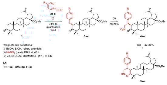 In order to fuse a 1,2-oxazine unit to the A-ring of BoOMe, a three-step approach was developed (Scheme 3). Starting from a base-promoted aldol condensation reaction of BoOMe (1) with benzaldehydes 2a-c, methyl (E)-2-benzylidenebetulonate derivatives 3a-c were obtained, which underwent a Michael addition of nitromethane, affording Michael adducts 4a-c. Then, the subsequent reduction in their nitro group and nucleophilic intramolecular ring cyclization led to the formation of the desired 1,2-oxazine-fused BoOMe compounds 5a-c.