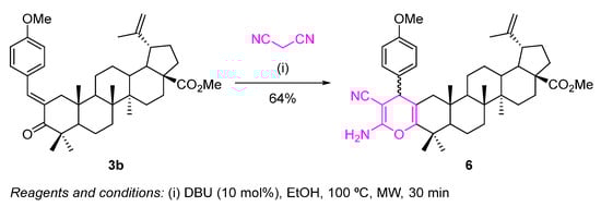 Using the methyl (E)-2-(4-methoxybenzylidene)betulonate (3b) as substrate, we were able to fuse a highly functionalized 4H-pyran to the A-ring of the triterpene scaffold through a one-pot microwave (MW)-assisted Michael addition of malononitrile to the α,β-unsaturated carbonyl derivative 3b, followed by an intramolecular cyclization (Scheme 5).