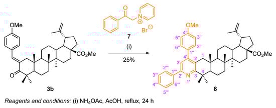 A diarylpyridine-fused BoOMe compound 8 was prepared following a Kröhnke synthetic route (Scheme 6). Once again, using the methyl (E)-2-(4-methoxybenzylidene)betulonate (3b) as starting material, the reaction was performed in the presence of an excess of the Kröhnke salt 7 and ammonium acetate, in refluxing acetic acid for 24 h. Compound 8 was obtained in poor yield (25%), still recovering some starting material 3b. In the literature, for simpler triarylpyridine derivatives, prepared through a similar methodology, it was observed that the presence of strong electron-donating groups, such as dimethylamino or methoxy groups, did not favor the reaction, since the corresponding triarylpyridines were obtained in poor yields (24–37%) [28]. Therefore, this might have happened for the diarylpyridine-fused BoOMe compound 8, as the starting material 3b also possesses a strong electron-donating methoxy substituent.