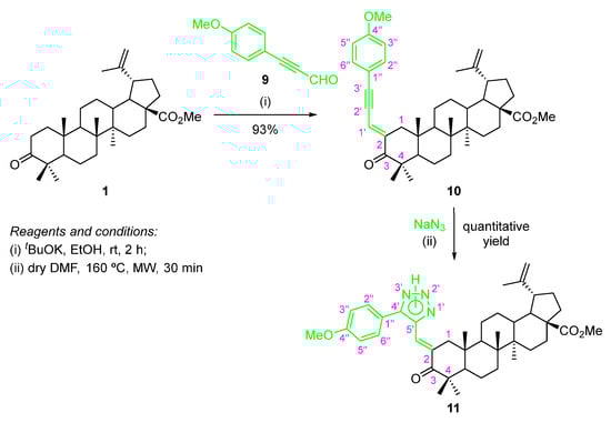 The first step involved a base-promoted aldol condensation reaction of BoOMe (1) with 3-(4-methoxyphenyl)propiolaldehyde (9) using tBuOK as a base (Scheme 7), affording the methyl (E)-2-[3-(4-methoxyphenyl)prop-2-yn-1-ylidene]betulonate (10) in excellent yield (93%). The required 3-(4-methoxyphenyl)propiolaldehyde (9), which are not commercially available, had to be synthesized according to a two-step procedure described in the literature [29]. The main feature in the 1H NMR spectrum of compound 10 is the resonance corresponding to the methine proton (=CH–), which appears as a broad doublet at δH 6.75 ppm. Additionally, in its 13C NMR spectra, the resonances of C-2′ and C-3′ of the triple bond (C2′≡C3′) can be observed at δC 86.2 and 103.2 ppm, respectively.