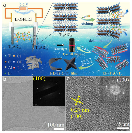 Scheme for the synthesis (a), TEM micrograph (b), and HR-TEM micrograph (c) of the fluoride-free Ti3C2Tx MXene. Reproduced with permission from ref. [45] Copyright 2022, The American Chemical Society.
