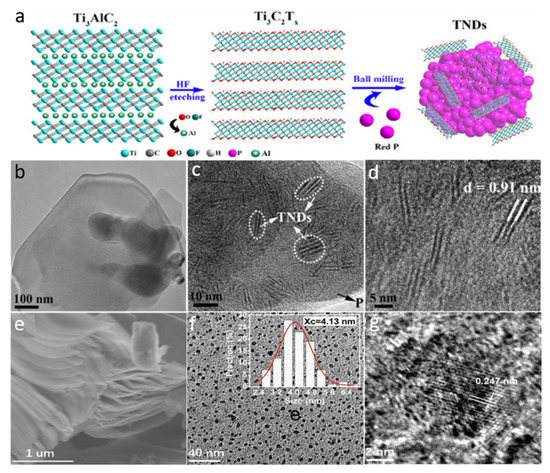 Different QDs have been successfully fabricated via the ball-milling approach, which is an extensively used top-down method for reducing the size of nanoparticles. The physical and morphological features of the produced materials are influenced by a variety of factors such as the milling type (wet or dry), speed of the milling, the ratio of the ball to powder weight, and milling time duration. Zhang et al. [67] used the ball-milling procedure to fabricate various-sized Ti3C2Tx MXene nanodots (TNDs) by mixing Ti3C2Tx with diverse solid-state precursors such as red P, S, C, and Si (see Figure 6a). Ball-milling of the mixture was performed at 550 rpm for 48 h under an argon environment, while keeping the powder-to-ball weight ratio at roughly 1:20. The of FE-TEM image of the Ti3C2Tx (Figure 6b) showed a μm-long thin layered structure. The red-P-assisted ball-milling of Ti3C2Tx results in QDs with a lateral diameter and thickness in the range of 6–25 nm (Figure 6c). The HR-TEM micrograph of Ti3C2Tx (Figure 6d) revealed an interlayer spacing of ~0.91 nm, corresponding to the (0002) planes, which confirms the development of MXene nanodots. During this process, the TiOX (X = C, P, S, Si) bond formation occurs, causing the delamination and reduction in the particle size of Ti3C2Tx MXene, which is governed by the strength of the OX link. The stronger the –OX interaction, the smaller the particle size will be. Due to the strong TiOX connection, a solid-state element existed in the product. This is an ideal method used to fabricate nanocomposites.