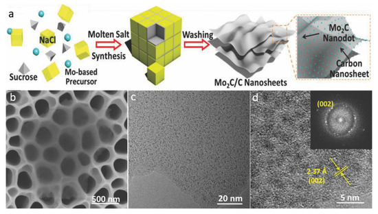 (a) Schematic for the fabrication of Mo2C/C nanosheets via molten salt method. (b) SEM micrograph, (c) TEM micrograph, and (d) HR-TEM micrograph with the inset showing the fast-Fourier-transform (FFT) pattern of the Mo2C/C nanosheets. Reproduced with permission from ref. [74] Copyright 2018, Wiley.