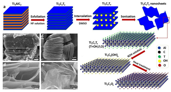 Global attention is currently focused on energy and environmental challenges. Electric vehicles and stationary batteries both require high-capacity energy conversion/storage systems, while the present energy conversion and storage techniques such as batteries, water splitting, and supercapacitors are being advanced. Thus, further research is required because simultaneous high energy conversion and power density is difficult to attain, and rechargeable technologies are expensive and limited in application [1,2,3,4,5,6]. Because of their unique physicochemical features, two-dimensional (2D) materials such as MXenes have received a lot of interest. MXenes are also very interesting in this context as they are relatively safe, have broad interlayer spacing, are environmentally flexible, and have excellent biocompatibility [7]. MXenes, a broad family of the 2D transition-metal carbides or nitrides, was recently developed by Drexel University researchers. The generic formula for MXenes is Mn+1XnTx (n = 1–3), where M stands for the transition metals (i.e., Ti, Zr, Ta, Nb, V, Mo, etc.) and X represents the carbon or nitrogen elements. Typically, MXenes are synthesized from the layered-structure MAX-phase bulk ceramic using fluoride-based chemicals to selectively etch (usually groups IIIA and IVA) layers, and their basal faces are frequently terminated with special surface functionalities (Tx), such as O, OH, and F. Due to their exceptional conductivity and the presence of abundant surface functionalities, MXenes with highly adjustable structural and chemical forms can perform both as fundamental active materials and carriers of additional functional materials for a variety of applications, such as photodetectors [8], flame-retardant polymer materials [9], water purification [10,11], energy conversion and storage [12,13,14], sensors, electro-magnetic interference shielding, gas separation, biomedical imaging and therapy, and catalysis [15,16,17,18].
