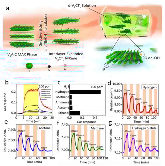 - Lee, E.; VahidMohammadi, A.; Yoon, Y.S.; Beidaghi, M.; Kim, D.-J. Two-Dimensional Vanadium Carbide MXene for Gas Sensors with Ultrahigh Sensitivity Toward Nonpolar Gases. ACS Sens. 2019, 4, 1603–1611. [Google Scholar] [CrossRef] [PubMed]