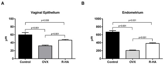 R-HA gel administration attenuated the atrophy of the endometrium (382.79 ± 17.18 vs. 207.46 ± 10.7 µm, p < 0.001) and thinning of the vaginal epithelium (46.56 ± 1.76 vs. 32.33 ± 1.87 µm, p = 0.001) as compared with the OVX group, though the endometrial structure still differed from the control rats (Figure 2).