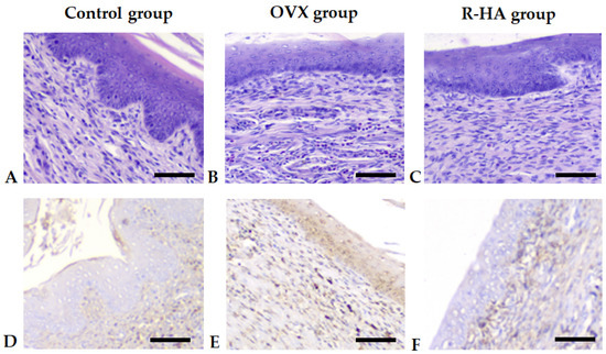 Impact of ovariectomy and R-HA treatment on vaginal mucosa. (A–C)—H&E staining. Scale bars 50 µm. (D–F)—Immunohistochemistry demonstrating COX-2 expression. Scale bars 50 µm. (A)—The vaginal mucosa of the control group. (B)—The vaginal mucosa of the rats after ovariectomy demonstrates thinning of the stratified squamous nonkeratinized epithelium and inflammatory infiltration of the lamina propria by polymorphonuclear leukocytes. (C)—R-HA treatment of ovariectomized rats attenuated inflammatory infiltration and prevented covering epithelium atrophy. (D)—A few COX-2 positive cells in vaginal mucosa of the control group animals. (E)—Increased number of COX-2 positive cells in the vaginal mucosa. (F)—Decline of COX-2 expression in vaginal mucosa after R-HA treatment.