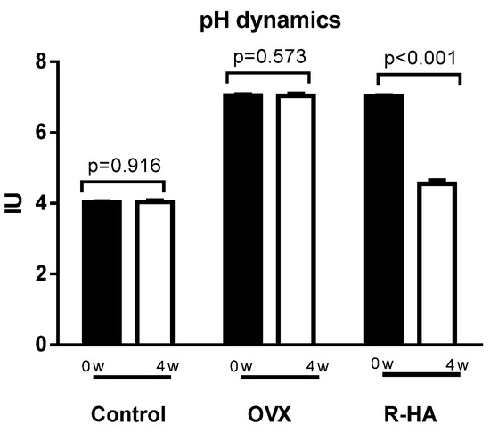The value of the vaginal pH in control, OVX animals, and in female rats before and after R-HA topical treatment. Data expressed as mean ± SEM. For comparison, paired sample t-tests were used.