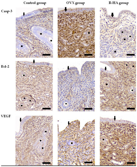 Changes in Casp-3, Bcl-2, and VEGF expression in experimental groups’ immunohistochemistry. Scale bars 50 µm. Ovariectomy resulted in thinning of endometrial lining epithelium (arrows), declining number of endometrial glands (asterisks), and changes in biomarkers expression. While Casp-3 expression increased in epithelium lining, endometrial stroma, and glands after ovariectomy, the levels of Bcl-2 dropped significantly in glandular cells as compared with the control group, shifting the balance between Casp-3/Bcal-2 towards pro-apoptogenic regulation. R-HA treatment attenuated the activation of pro-apoptogenic pathways through elevation and Bcl-2 expression and reduction of Casp-3 levels especially in glands. This effect was associated with enhancement of VEGF expression in both endometrial stroma and glands.